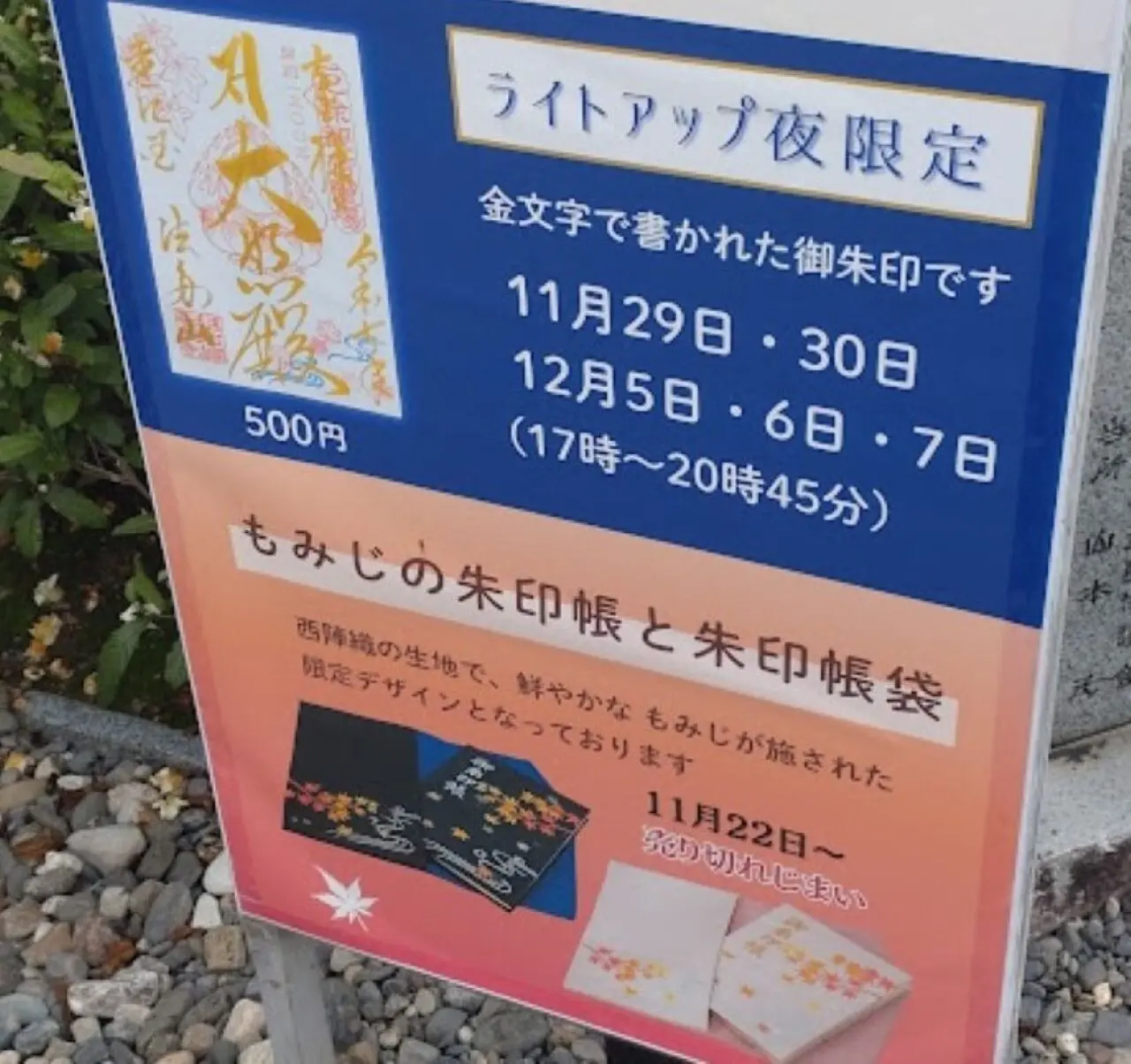 また2025年11月29日(土)、30(日)、12月5日(金)、6(土)、7(日)の17:00~20:45には、ライトアップ限定御朱印がいただけるとのこと!ゴールドの墨文字は特別感があり、こちらも、是非欲しくなる御朱印となっていますね♪